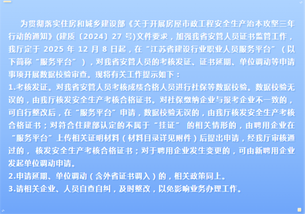 转发 | 省住建厅执业资格考试与注册中心:关于加强我省安管人员考核合格证书业务申请审查的工作提示 附件:1764733064-关于加强我省安管人员考核合格证书业务申请审查的工作提示 苏州建设职业培训中心2025-12-03T11:39:03+08:002025年12月3日|分类:其他, 新闻资讯, 首页推荐|